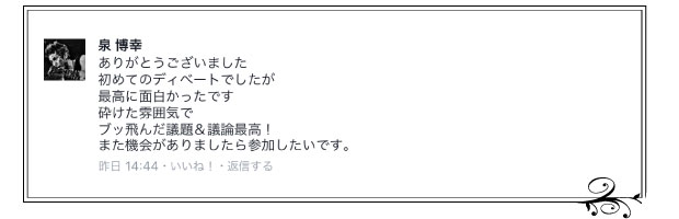 >明石さん:ディベートの誤解をとくようなコメントを頂きありがとうございました。そして、お上手でした。