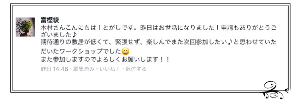 はい。ございます。現在、別のところでオンライン講座をしております。今後は、ワークショップ終了後は、興味がある人だけで2時間の講座をすることも検討しています。