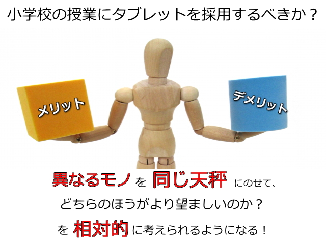 例えば、ICT教育を実現するために、小学校の授業にタブレットを取り入れるべき!と誰かが主張するとします。